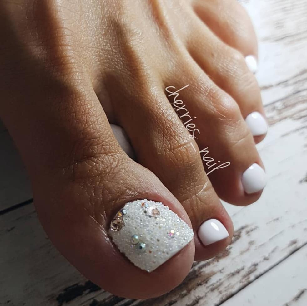 Белый педикюр со стразами
